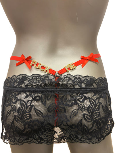 This red “Fuck Me” rhinestone panty features a metal and rhinestone G-string design for a striking, unapologetic look. Crafted from stretchy nylon and spandex, it offers a secure fit with adjustable straps for comfort and flexibility. Subtle bow tie detailing...